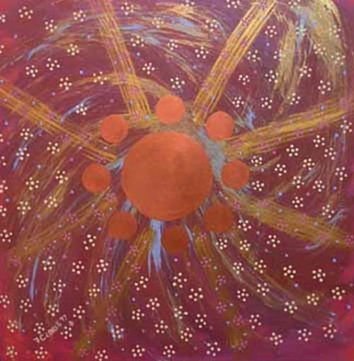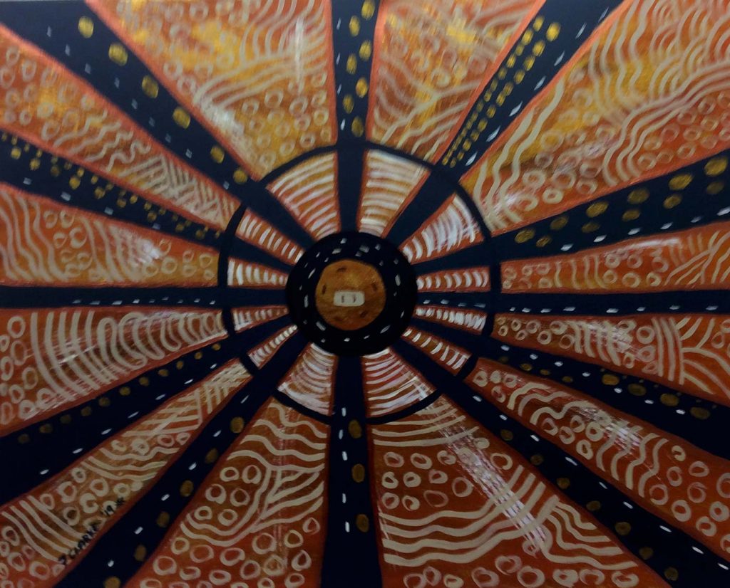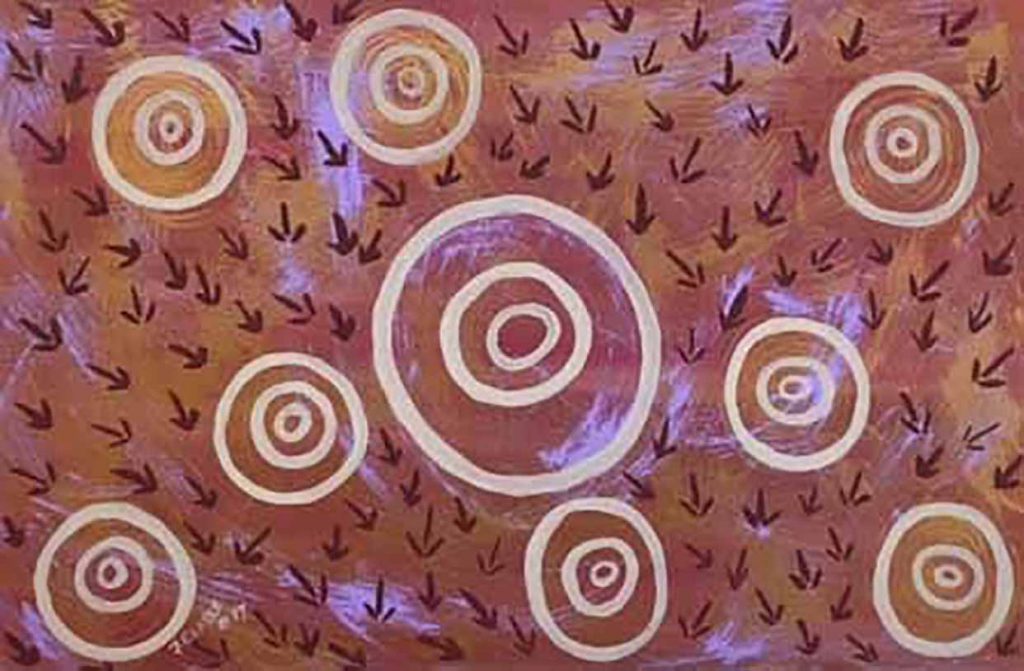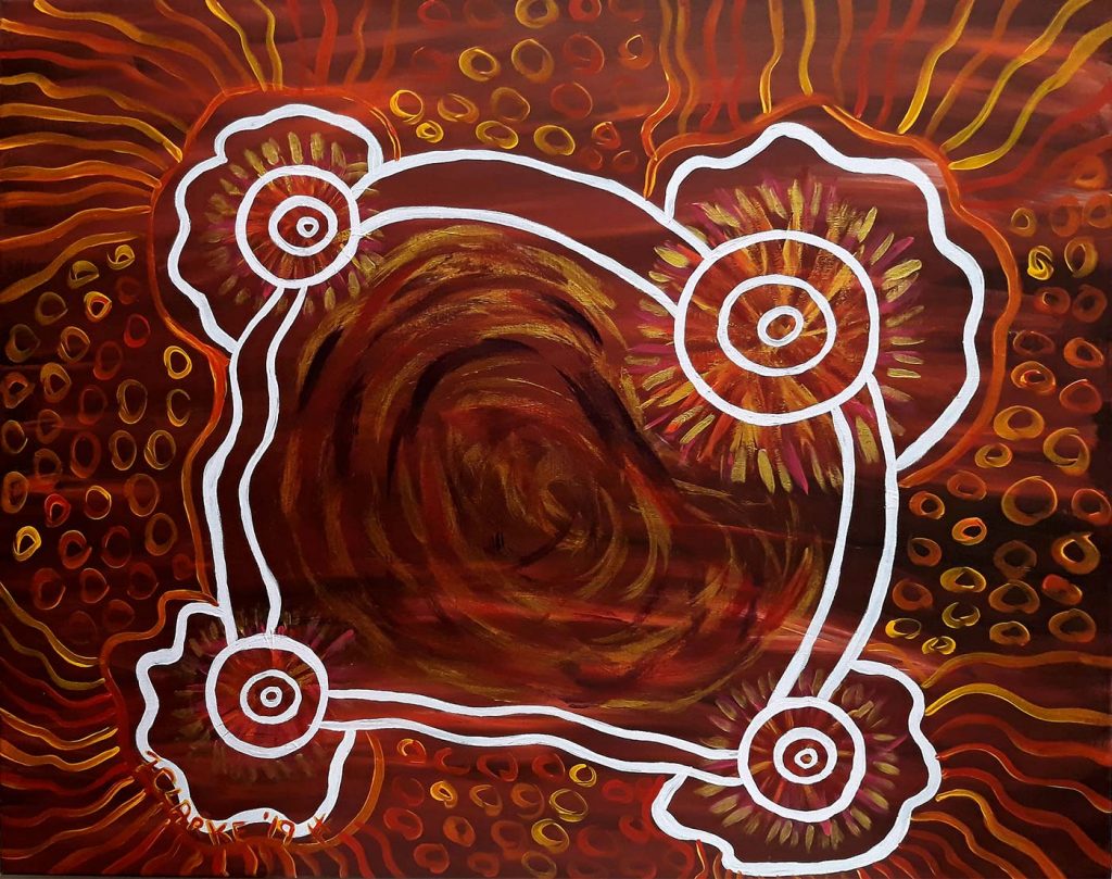The boomerangs represent the returning of everything. The circle is the waterhole. The lines and earth colours are the land.